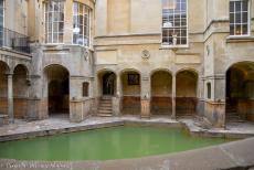 Classic Car Road Trip: Op weg naar het IMM 2019 in Bristol bezochten we de Romeinse Baden in Bath, een prachtige stad in Somerset. Het King's Bath is een van de baden, het werd gebouwd in de 12de eeuw, de Grand Pump Room is op de achtergrond te zien. De Romeinen gebruikten het water uit de nabijgelegen natuurlijke warmwaterbronnen om de grote waterbassins te vullen.