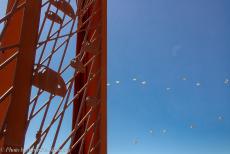 Classic Car Road Trip: Een grote paradropping boven de Ginkelse Heide 75 jaar na de Slag om Arnhem, aan de linkerkant het Airborne Monument 'Windows of the Past' op Ginkelse Heide in Ede. Het indrukwekkende zes meter hoge monument werd ontworpen door de Nederlandse beeldend kunstenares Karin Colen in 2019.